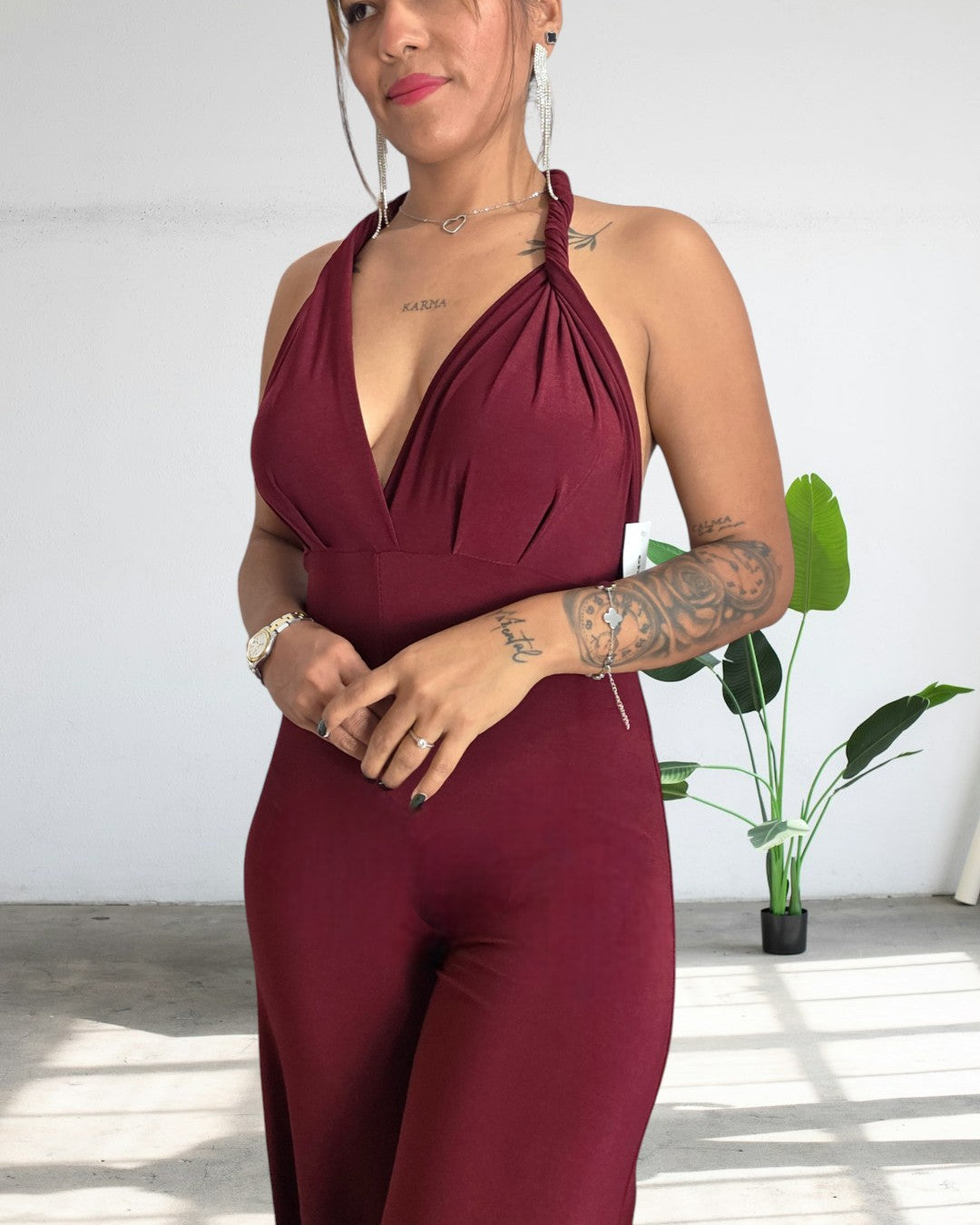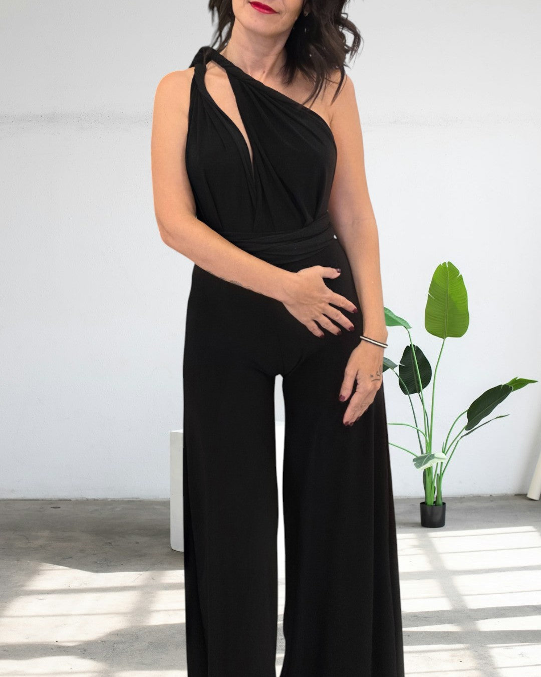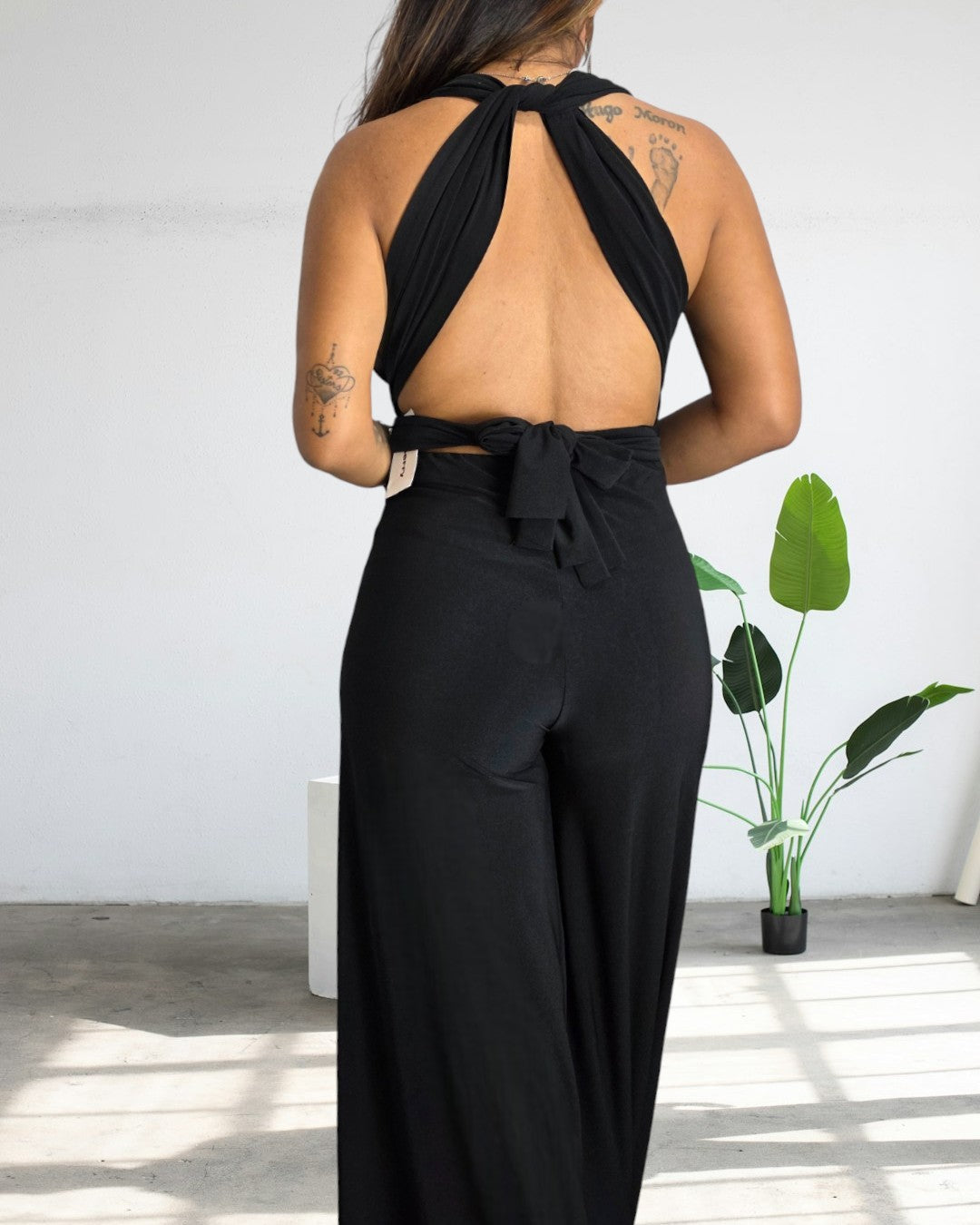 Detalle del producto : Mono largo multiposición . Pantalón ancho fluido, los tirantes se ajustan alrededor del contorno del cuerpo con la posibilidad de ponerlo en varias posiciones. Cintura elástica